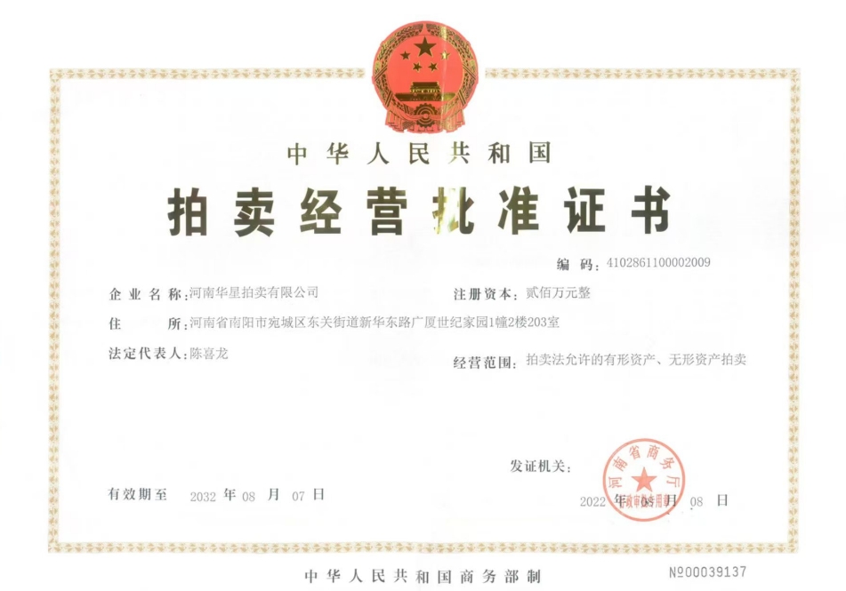 拍賣經(jīng)營批準證書 |